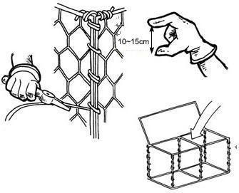 4、各個(gè)表面綁扎在一起。使用長(zhǎng)度適宜的綁絲,首先綁扎在一頭,然后間隔10~15cm穿過(guò)網(wǎng)孔,進(jìn)行單圈、雙圈的交替纏繞。為了保證網(wǎng)面間的緊密結(jié)合,纏繞時(shí)要用力,拉緊。 隔板絞合時(shí)注意沿一條豎直線絞合,而且絞合后的隔板是在同一豎直面上。