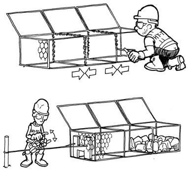 注意:因?yàn)榇虬谋容^緊密,所以剪斷捆扎絲的時(shí)候,大包會(huì)一下子散開(kāi)。 石籠網(wǎng)箱內(nèi)填充的石料應(yīng)堅(jiān)硬、耐用、不易碎,石頭的粒徑應(yīng)控制在10~20cm之間,可以有5%的變化,但最小粒徑不得小于網(wǎng)孔尺寸。
